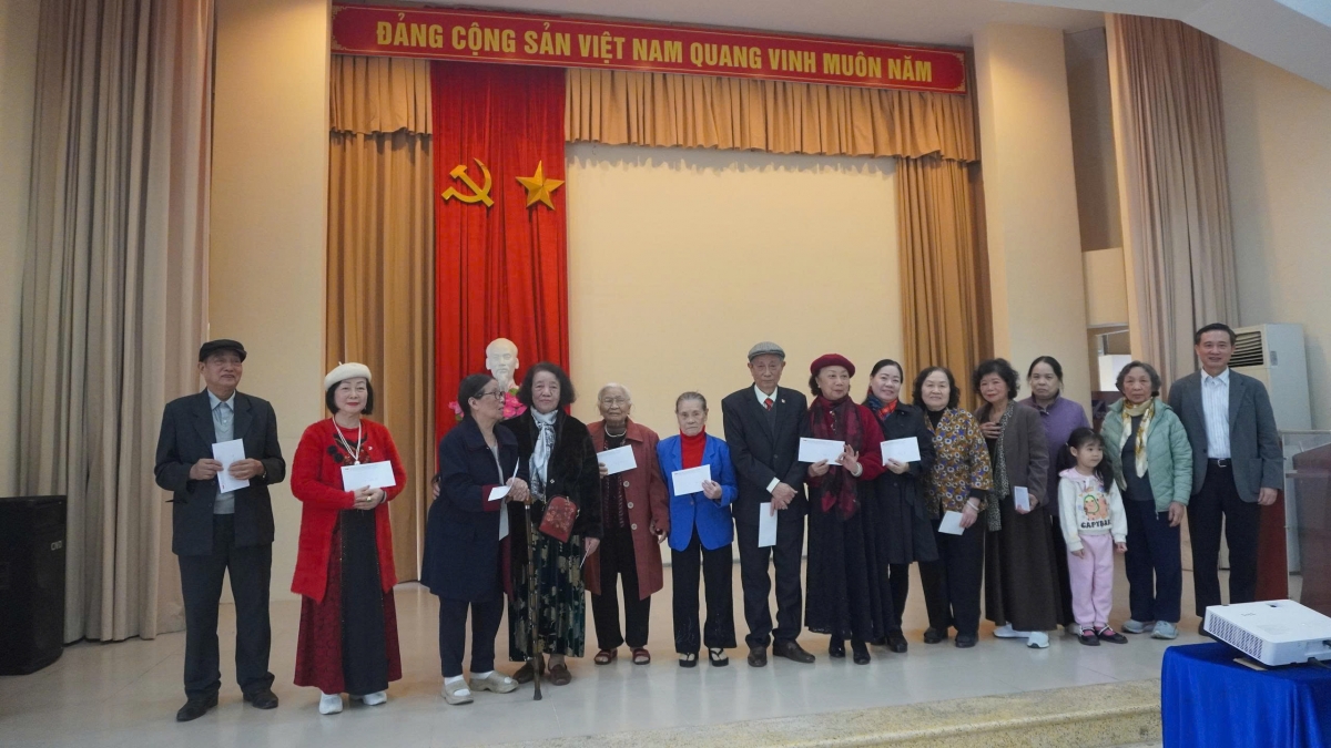 Thay mặt các cán bộ hưu trí, ông Trần Ngọc Chính tặng hoa chúc mừng kết quả VIUP đạt được trong năm 2025