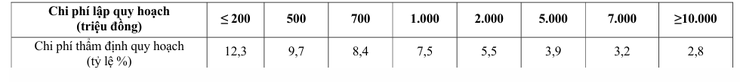 Bảng số 2: Định mức chi phí thẩm định lập quy hoạch xác định theo tỷ lệ phần trăm của chi phí lập quy hoạch