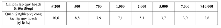 Bảng số 3: Định mức chi phí quản lý nghiệp vụ công tác lập quy hoạch xác định theo tỷ lệ phần trăm của chi phí lập quy hoạch